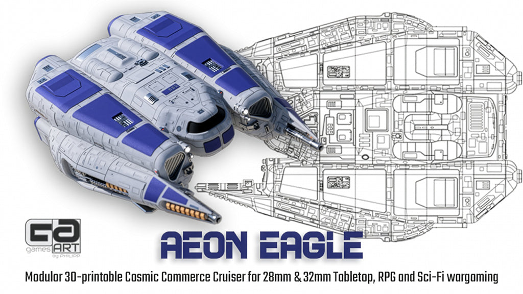 A modular interstellar trader ship designed for narrative and tactical tabletop play, featuring a fully playable interior built around expandable room modules.